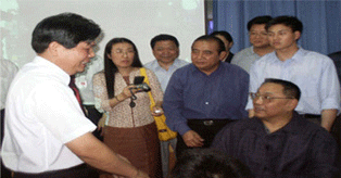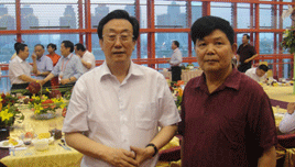 時任河南省人民政府省長郭庚茂先生(左)與臺州商會支部書記、《百花散》傳人梅安富先生合影